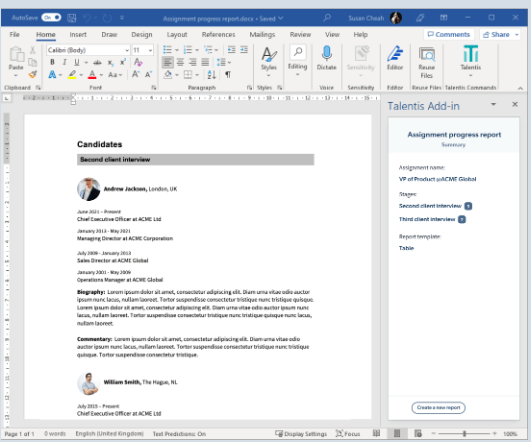 The next major functionality release will be reporting. Talentis will be offering users the ability to report from inside Word itself. It’s a dramatically better way of working, and we can’t wait for you to see it. The functionality is basically complete, but we are waiting for Microsoft to release the add-in to the Microsoft store. When it’s available, however, we’ll email you with details of how to use Talentis Add-In for Microsoft Word and a quick video showing how it works. Here’s a quick screenshot: